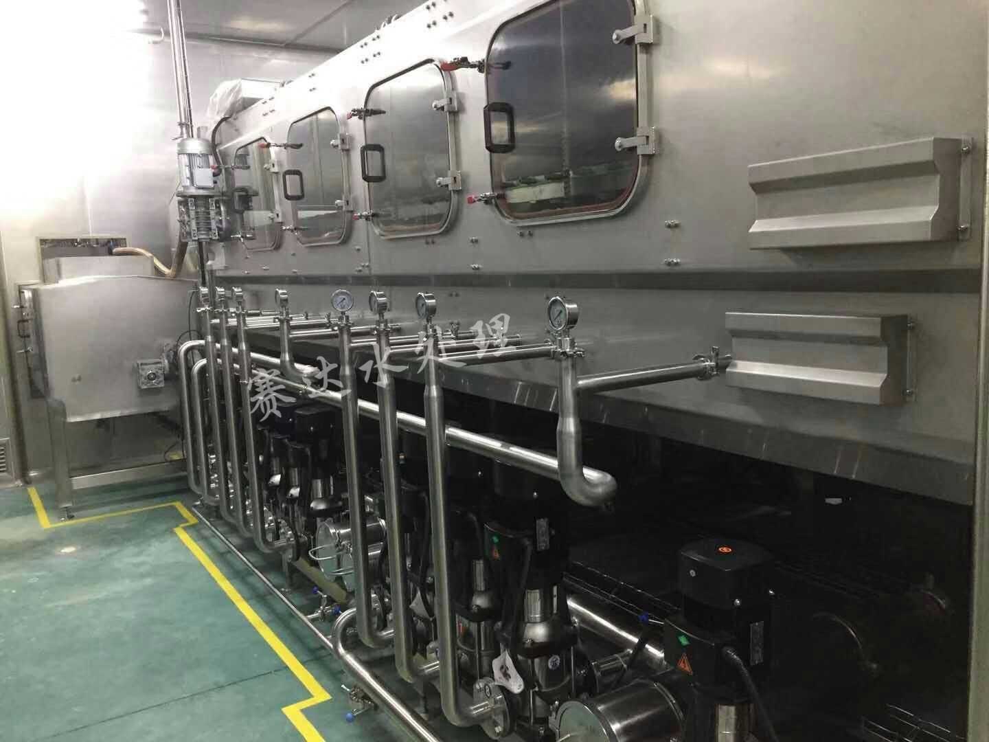 桶裝水灌裝機集消毒、沖洗、灌裝、封蓋于一體,其沖洗工位包括:熱堿液噴洗、、消毒液噴洗、道回用水噴洗、成品水噴洗、滴干等工位,具體根據用戶要求,做6-20個不同的沖洗工位。
